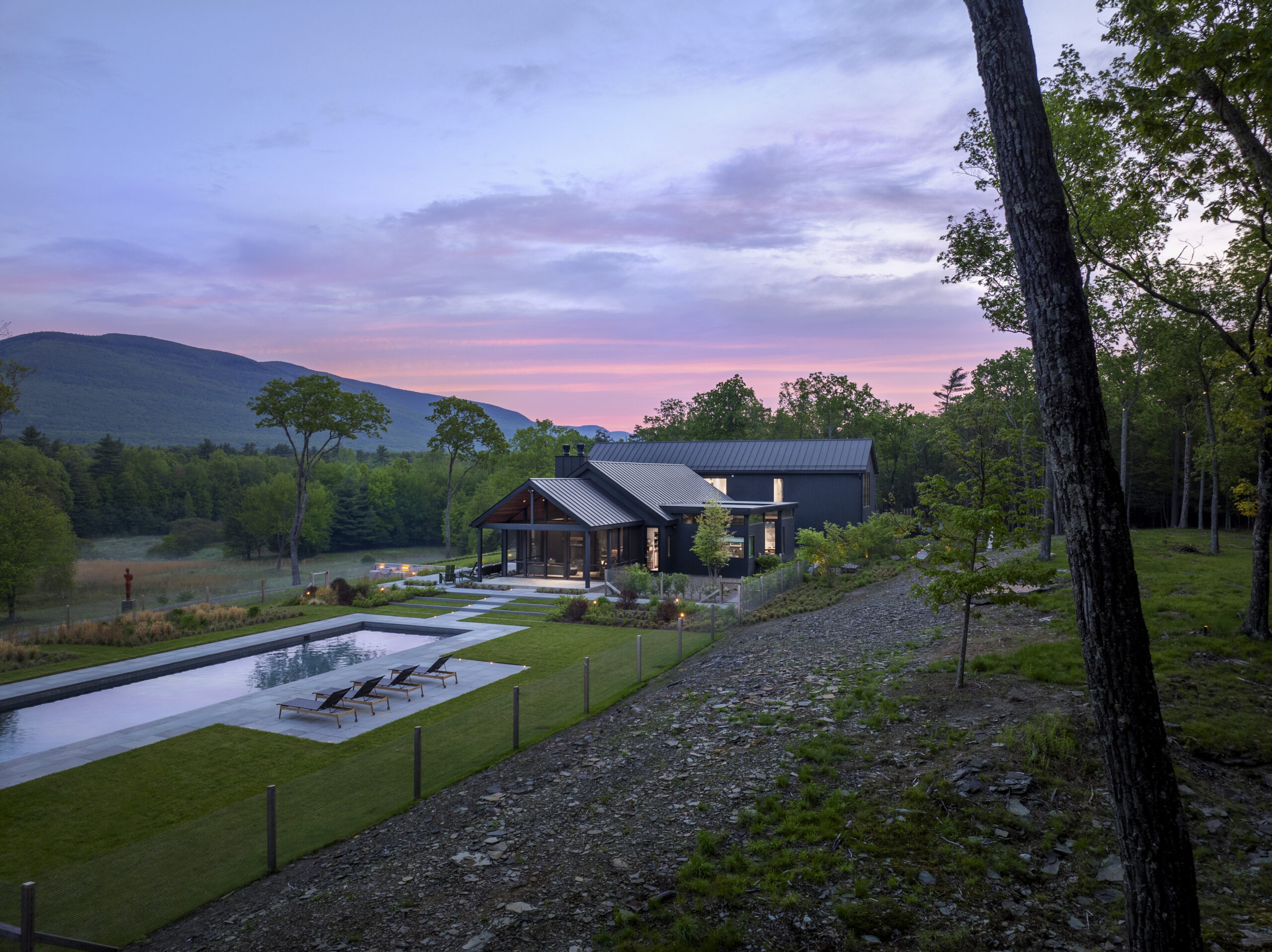 We’re so excited to present our first full-fledged outdoor design! We worked closely with our clients to transform their existing exterior space from an informal gravel patio space into a series of gathering areas that are a better match to their incredible site and views. The existing home looks out across the Ashokan Reservoir, and