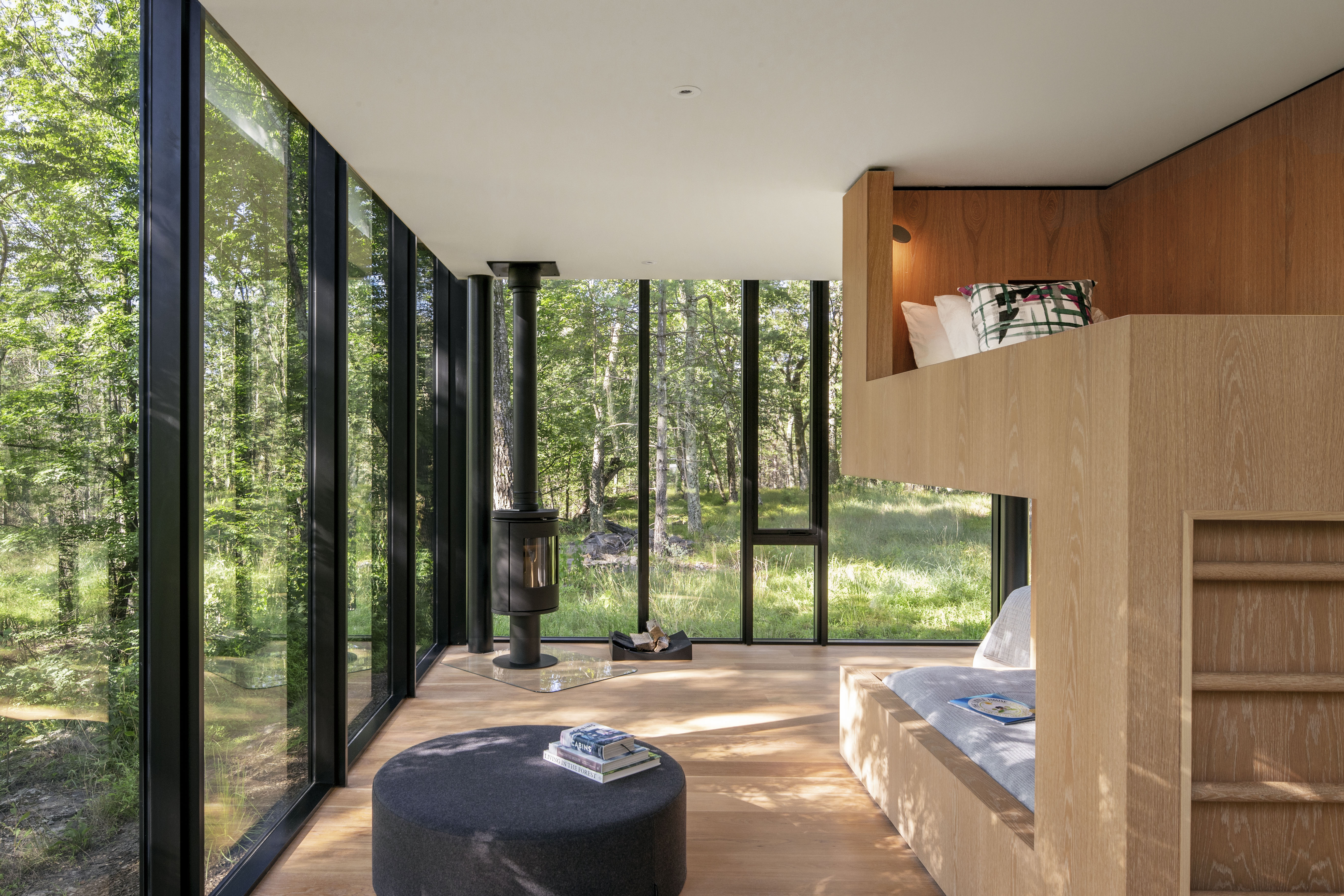 Warm white oak wraps the bunks, creating cozy spaces that are comfortable and inviting. Supplemental furniture is minimal – the bunk adjacent to the wood stove can double as a “couch” if left uninhabited. Black accents in the windows and fascia are carried to the interior columns, the black stone countertops and reveal details in the bunk volume. Integrated lights, outlets and cubbies in each bunk add critical functionality for guests.