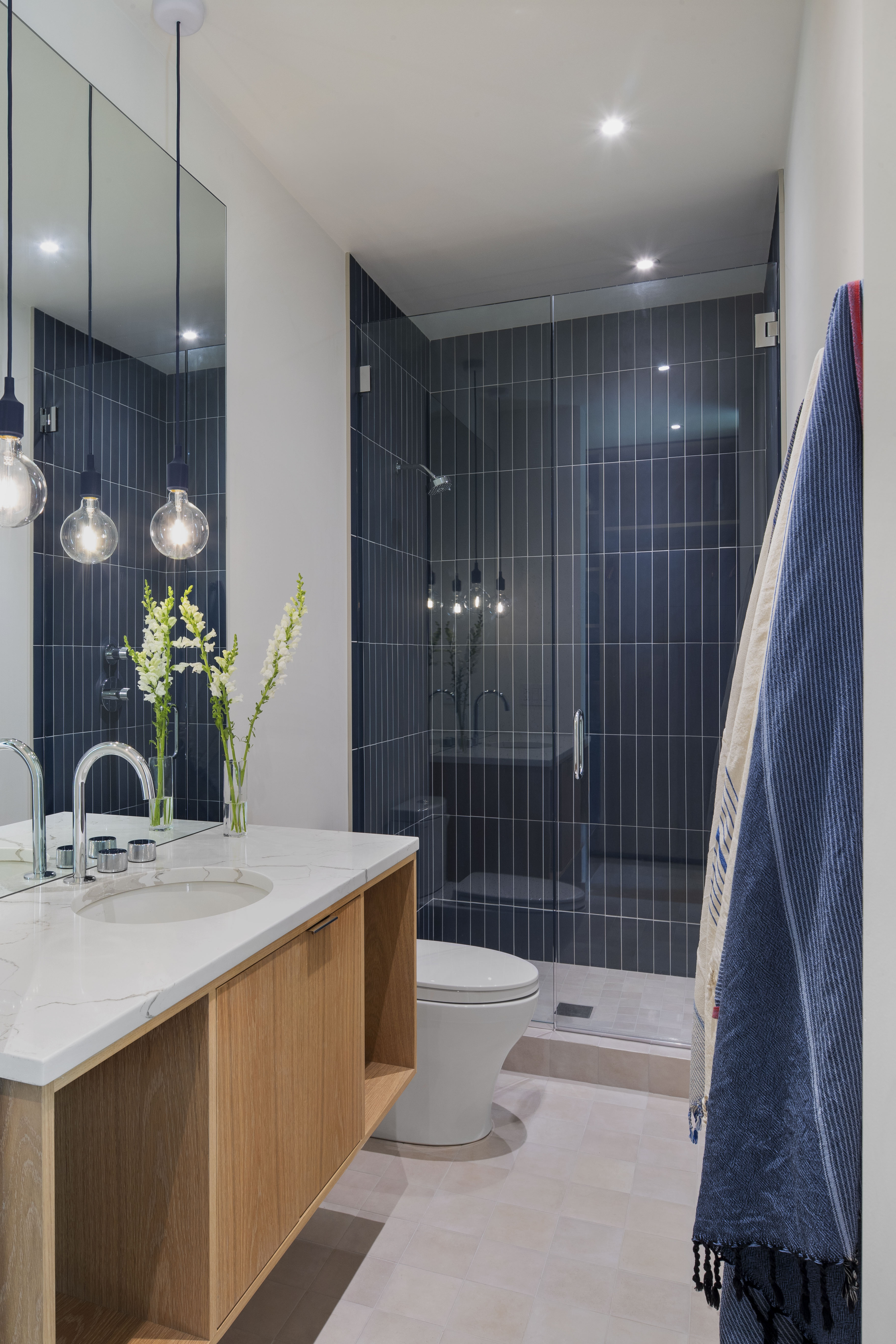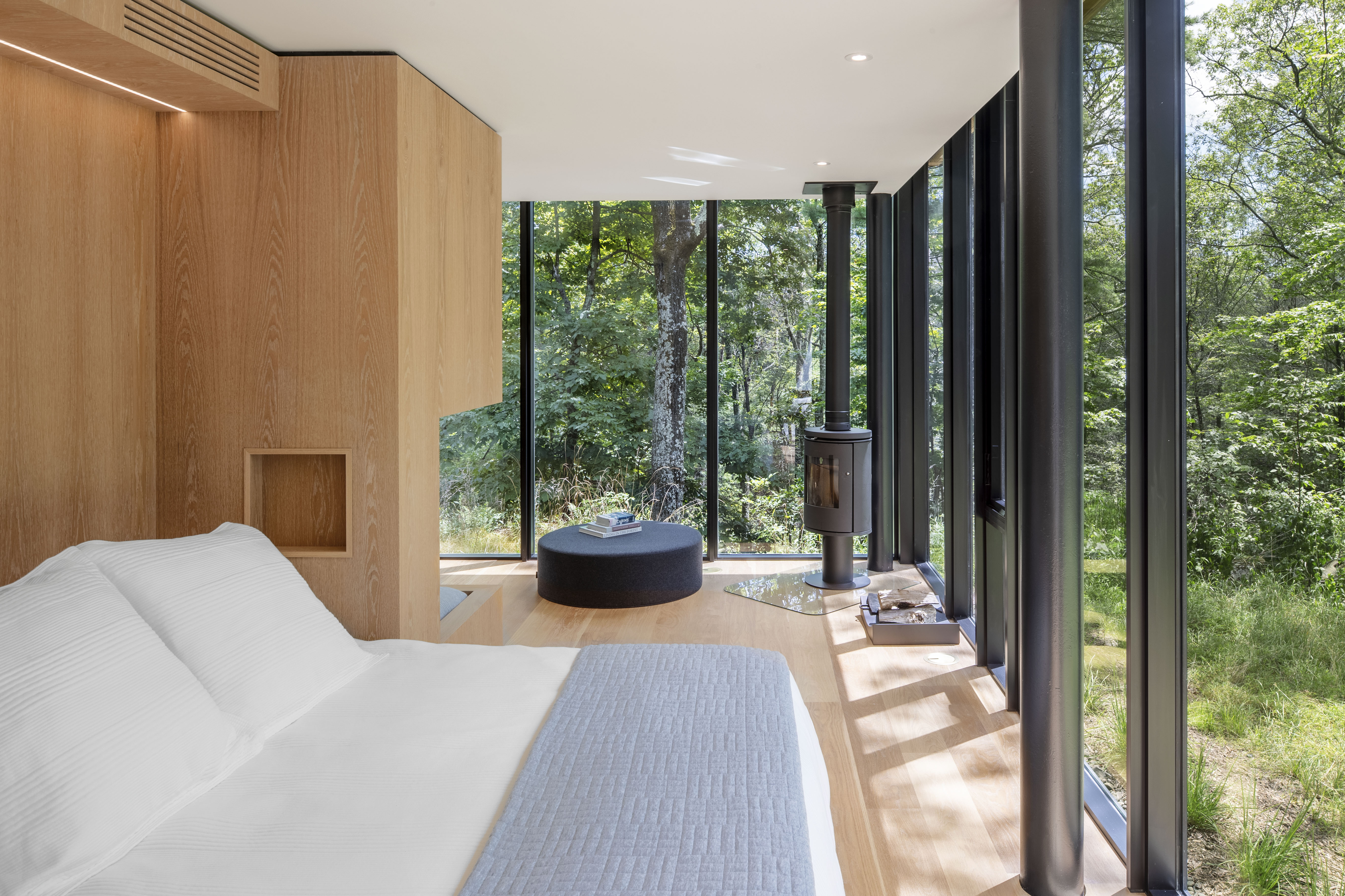 The windows of the Bunkhouse extend beyond the ceiling, drawing your eye upwards. The thin roofline floats above the windows, creating a lighter profile for the exterior of the Bunkhouse and accentuating the glass jewel box effect. A hidden lighting cove casts a warm glow around the space and continues to draw the eye upwards in the evenings. A wood burning stove provides supplemental heat, while mechanicals are neatly tucked away within the jewel box core.